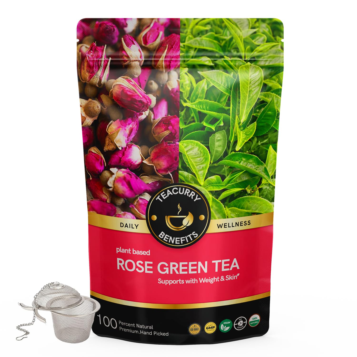TEACURRY Rose Green Tea | 200 Grams Loose / 100 Cups + Infuser Rose Green Tea Helps Lose Weight, Boosts Digestion, Relieves Anxiety, Increases Skin Glow | Rose Tea Petals