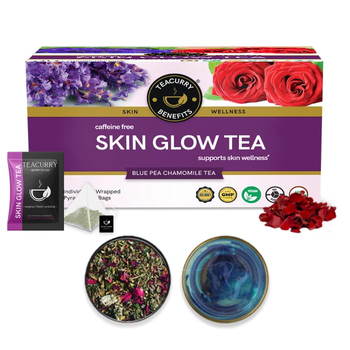 • 100% Natural Ingredients - Teacurry Skin Glow Tea is a unique blend of butterfly blue pea flowers moringa liquorice chamomile flowers lavender rose spearmint nettle thymus and cassia .
