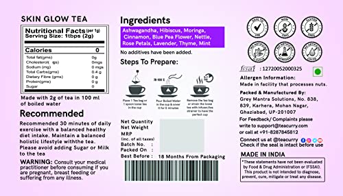 Teacurry Skin Glow Tea made from natural ingredients like butterfly blue pea flowers and chamomile nourishes and detoxifies your skin enhancing your skin tone with a sweet warm flavor suitable for all ages and skin types.