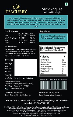 Teacurry Slimming Tea or 28 Day Slimming Tea is the perfect blend of herbs and Green Tea for managing weight purposes and for cleansing the body It is a delicious blend of traditional herbs mixed with green tea and is a way to manage weight in a small period. The research is that Teacurry Slimming Tea stimulates digestion aids metabolism and helps reduces fat to help with weight management. Being all-natural tea it provides 3 very specific benefits - enhanced metabolic rate and liver detoxification Teacurry's effective slimming tea helps with releasing excess water weight and purifies the body of toxins Teacurry slimming tea for managing weight and also helps to reduce extra weight. Teacurry weight manage tea consists of a powerful Ayurvedic tea blend of Green tea leaves from Assam Hibiscus Sabdariffa variety from farmlands in Mysore mighty Ginger from Orissa Meghalayan cinnamon Krishna Tulsi from Sasangir Foenum Graecum Fenugreek from Rajasthan Gujrat Fennel and Mentha Spicata Spearmint from West Bengal. Handpicked from tea fields in Assam Green tea leaves assist with managing fat and improving metabolism. Spearmint Ginger and fennel - selected and dried in-house further add to the unique slimming properties of Teacurry Manage weight tea.