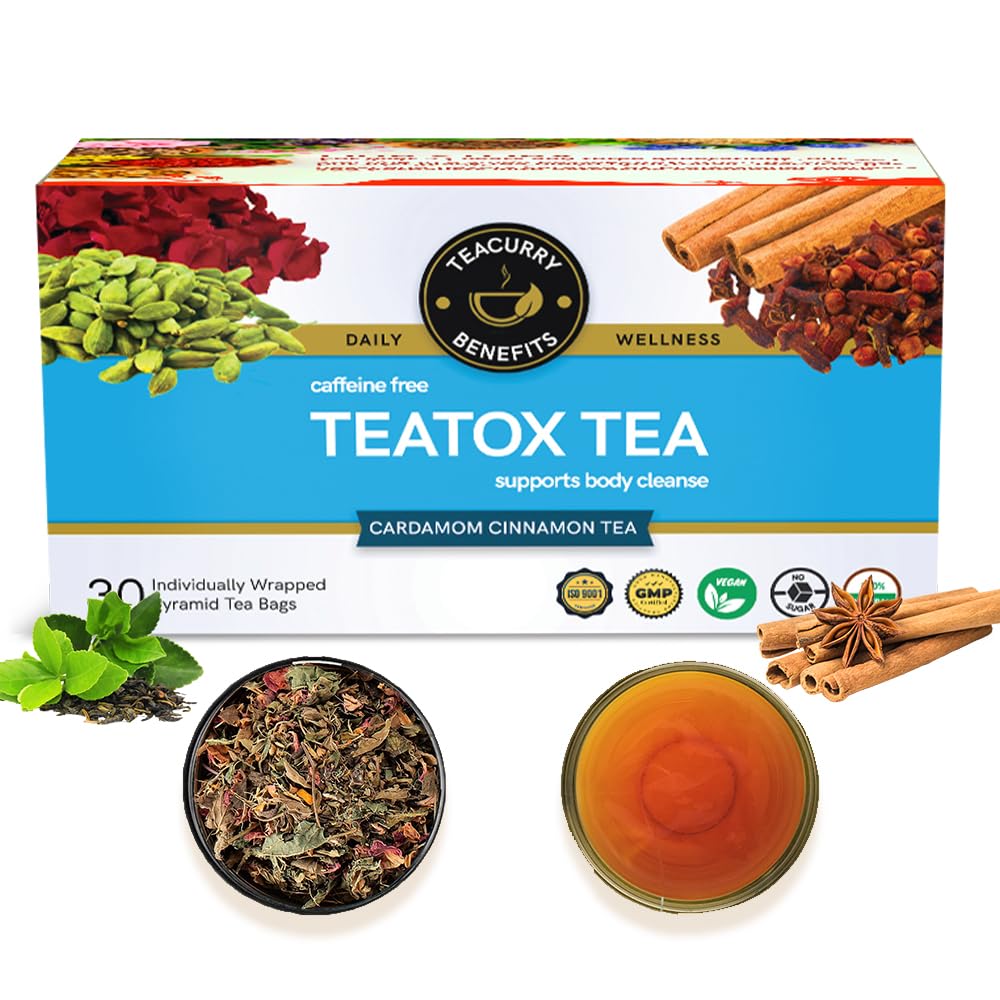 Teacurry Teatox Tea is a natural blend of carefully selected herbs and ingredients designed to support your body wellness. Made with all plant-based ingredients like green tea Cinnamon Ginger and Black Pepper Cardamom clove this teatox tea helps to cleanse and refresh your body in every sip.