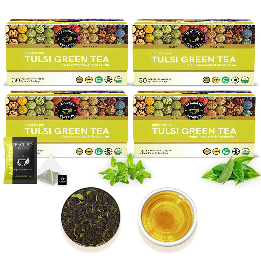 TEACURRY Tulsi Green Tea (120 Tea Bags, 4 Months Pack) - Tulsi Green Tea Bags, Tulsi Green, Prevents Respiratory Disorders, Beats Stress and Regulates Sugar - Tulsi Green Tea Organic