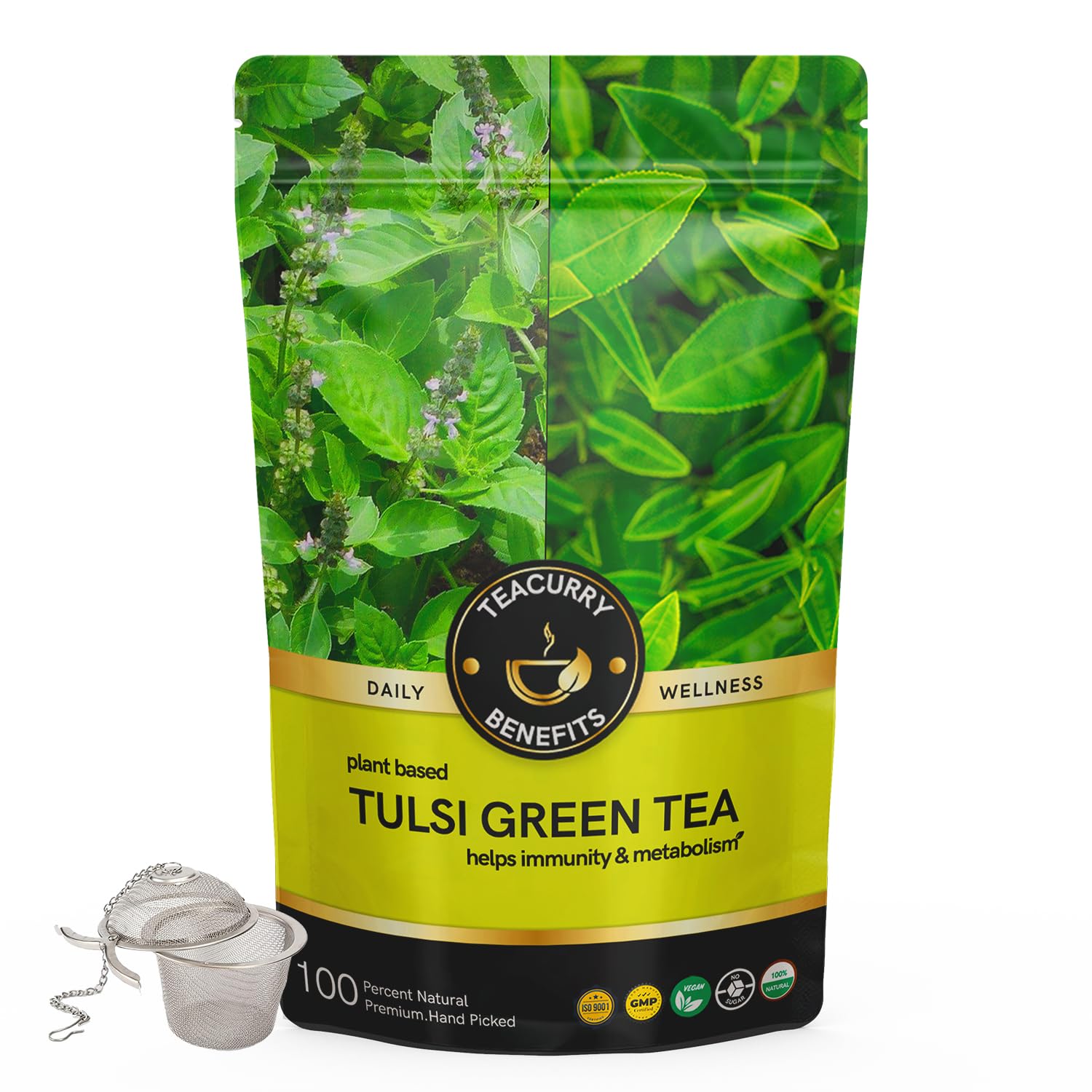 TEACURRY Tulsi Green Tea - 200 Gms Tulsi Green Tea + Infuser | Tulsi Green Tea Promotes Weight Loss, Prevents Respiratory Disorders, Regulates Sugar | Tulsi Green Tea Organic