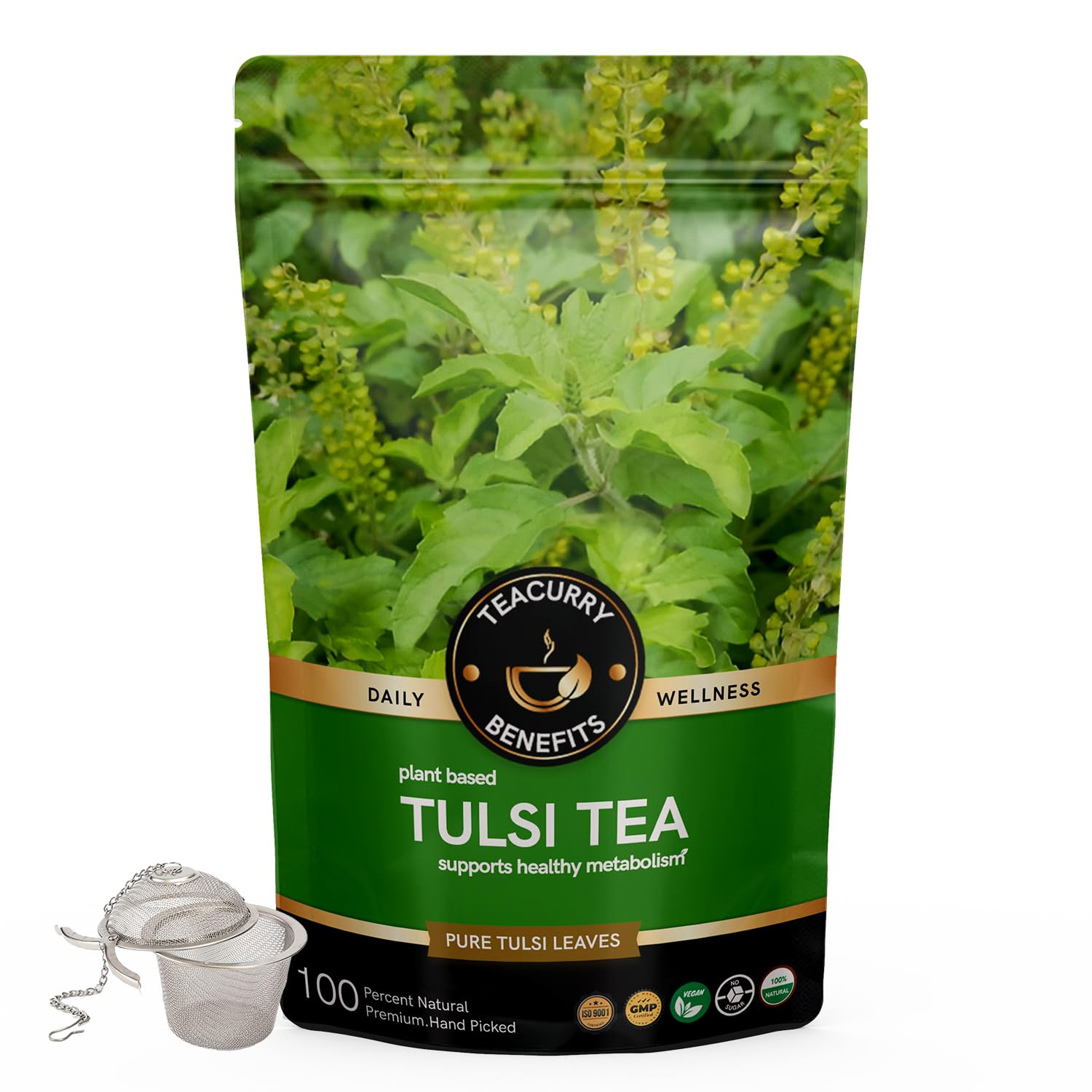 TEACURRY Tulsi Tea (1 Month Pack, 100 Grams) + Infuser - Helps with Blood Sugar, Dental health & Stress