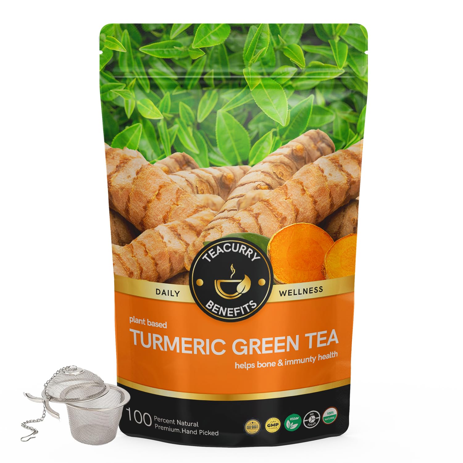 TEACURRY Turmeric Green Tea - 200 Gms Loose Tea + Infuser | Helps with Arthritis, Ulcer, Cholesterol, Immunity