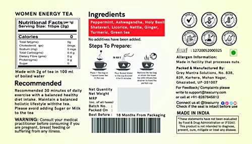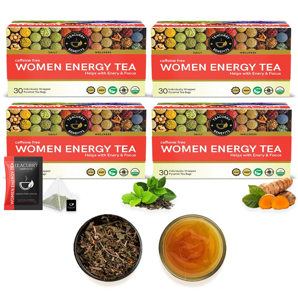 Perseverance and high energy levels are qualities that are required more by women than men. The good news is that everything you require is already within you. Teacurry Women Energy Tea stimulates your inner sources and helps you recharge your batteries. Whether youâre looking for something to perk you up in the morning or power you through a long day and into the night this Women Energy Tea is a great way to boost up and increase your energy and alertness. This hearty blend can get your day off to a great start while this boost will not keep you up all night. This Energy Tea Bags is a delicious way to enhance your overall well-being and harness your feminine energy. Purposefully formulated to work with your body this blend will leave you feeling healthy strong and graceful. Teacurry Women Energy Tea contains a moderate amount of caffeine which can give you the energy you need when youâre feeling sluggish. It consists of Peppermint Ashwagandha Holy Basil Shatavari Licorice Nettle Ginger Turmeric and Green Tea. All these provide the perfect blend for energy and it contains no preservatives no artificial flavours and is 100% Vegetarian. Our Teacurry Women Energy tea blend follows all the recommended standards by FSSAI WHO and NCBI. This Herbal Tea for Energy is a great alternative to other caffeinated beverages like coffee and energy drinks.