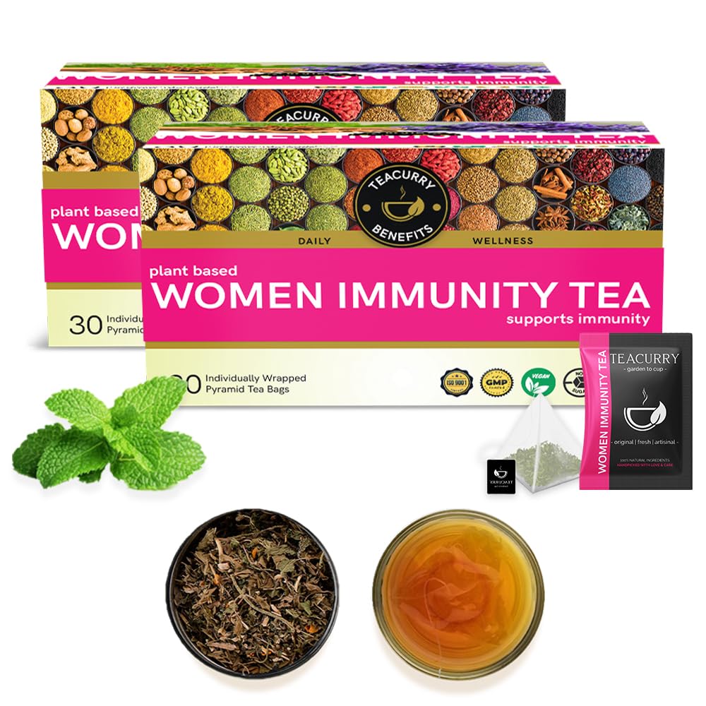 Women Immunity Tea consists of a powerful Ayurvedic tea blend of Cassia cinnamon from Meghalaya mighty ginger from Orissa Panniyur-3 black pepper from Kerala Turmeric Curcumin Longa sourced from farmers in Andhra Pradesh Carom seeds from Punjab Peppermint