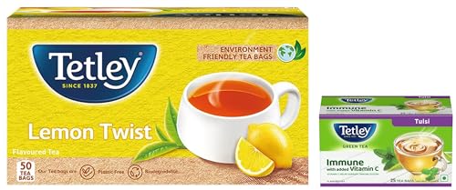 Tetley | Lemon Flavoured Refreshing Tea | Black Tea | 50 Tea BagsNow refresh rejuvenate and relax with Tetley. Introducing Tetley Lemon Twist Tea which indulges you in the refreshing flavour of lemon. The first sip will make you smile at the zesty freshness of our unique lemon flavour. The next sip will delight you with the full-bodied robustness and rich taste of our unique Assam blend. Before you know it youâre enveloped in the golden glow that comes with the perfect cup of our Lemon Twist. Itâs that little moment when delightful lemon comes together with the finest Assam Tea to bring a touch of magic to your day. Tetley is available in a variety of black tea flavours including Tetley Original Masala Chai Elaichi Ginger Zing Darjeeling and English Breakfast.Tetley Green Tea Immune Tulsi | With Added Vitamin C | Natural Flavour | 25 Tea BagsTetley Green Tea now with an extra punch! Tetley Green Tea is undoubtedly an excellent source of antioxidants. All the goodness now comes with an extra punch of added Vitamin C with the new Tetley Green Tea Immune Range. While antioxidants help cleanse your body from within Vitamin C helps support your bodyâs immune system. Each cup provides 10% of your daily requirement of Vitamin C. Enjoy this great tasting cup of Green Tea with memorable Tulsi flavour that ensures rejuvenation in every sip. #A cup of green tea contains as much as 5 times (5x) the antioxidants as an apple. (âUSDA Database for the Flavonoid Content of Selected Foodsâ Rel 3.3 March 2018).