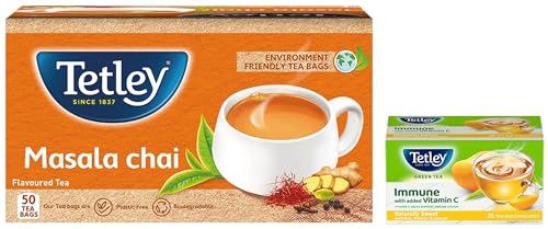 Tetley | Masala Chai with Natural Flavour | Black Tea | 50 Tea BagsNow refresh rejuvenate and relax with Tetley. Introducing Tetley Masala Chai which indulges you in the refreshing flavours of spicy masala. The first sip will overwhelm you with spicy mix of our renowned Masala flavour. The next sip will delight you with the full-bodied robustness and rich taste of our unique Assam blend.Before you know it you're enveloped in the lip-smacking bliss that comes with the perfect cup of Masala chai. It's that little moment when our spicy Masala collides with our finest Assam tea to bring a touch of magic to your day. Tetley is available in a variety of black tea flavours including Tetley Original Lemon Twist Elaichi Ginger Zing Darjeeling and English Breakfast.Tetley | Naturally Sweet Green Tea with Mango Flavour | Immune with Added Vitamin C | Green Tea | 25 Tea BagsTetley Green Tea is undoubtedly an excellent source of anti-oxidants. All the goodness now comes with immunity power of added Vitamin C with new Tetley Green Tea Immune Range. While anti-oxidants help cleanse your body from within Vitamin C helps support your bodyâs immune system. This green tea with no calories provides many more benefits like boosting fat metabolism helping to stay hydrated and helping to feel light and active. Driven by sustainability these green tea bags are 100% plastic-free and staple-free. The naturally sweet mango contain 100% natural flavors. # A cup of green tea contains as much as 5 times (5X) the anti-oxidants in an apple. (âUSDA Database for the Flavonoid Content of Selected Foodsâ Rel 3.3 March 2018)