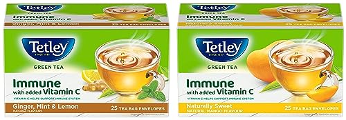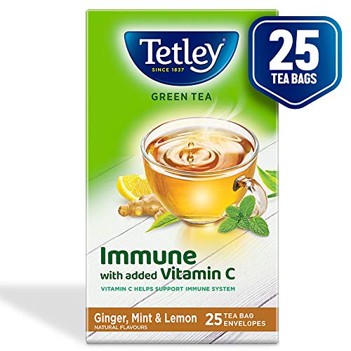 Tetley | Ginger Mint & Lemon Flavored Green Tea | Immune with Added Vitamin C | 25 Tea BagsTetley Green Tea is undoubtedly an excellent source of anti-oxidants. All the goodness now comes with immunity power of added Vitamin C with new Tetley Green Tea Immune Range. While anti-oxidants help cleanse your body from within Vitamin C helps support your bodyâs immune system. This green tea with no calories provides many more benefits like boosting fat metabolism helping to stay hydrated and helping to feel light and active. Driven by sustainability these green tea bags are 100% plastic-free and staple-free. The flavoured variants contain 100% natural flavors. # A cup of green tea contains as much as 5 times (5X) the anti-oxidants in an apple. (âUSDA Database for the Flavonoid Content of Selected Foodsâ Rel 3.3 March 2018)Tetley | Naturally Sweet Green Tea with Mango Flavour | Immune with Added Vitamin C | Green Tea | 25 Tea BagsTetley Green Tea is undoubtedly an excellent source of anti-oxidants. All the goodness now comes with immunity power of added Vitamin C with new Tetley Green Tea Immune Range. While anti-oxidants help cleanse your body from within Vitamin C helps support your bodyâs immune system. This green tea with no calories provides many more benefits like boosting fat metabolism helping to stay hydrated and helping to feel light and active. Driven by sustainability these green tea bags are 100% plastic-free and staple-free. The naturally sweet mango contain 100% natural flavors. # A cup of green tea contains as much as 5 times (5X) the anti-oxidants in an apple. (âUSDA Database for the Flavonoid Content of Selected Foodsâ Rel 3.3 March 2018)