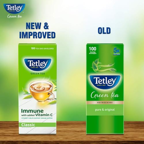 Tetley Green Tea is undoubtedly an excellent source of anti-oxidants. All the goodness now comes with immunity power of added Vitamin C with new Tetley Green Tea Immune Range. While anti-oxidants help cleanse your body from within Vitamin C helps support your bodys immune system. This green tea with no calories provides many more benefits like boosting fat metabolism helping to stay hydrated and helping to feel light and active. Driven by sustainability these green tea bags are 100% plastic-free and staple-free. The classic green tea contains 100% natural flavors. # A cup of green tea contains as much as 5 times (5X) the anti-oxidants in an apple. (USDA Database for the Flavonoid Content of Selected Foods Rel 3.3 March 2018)