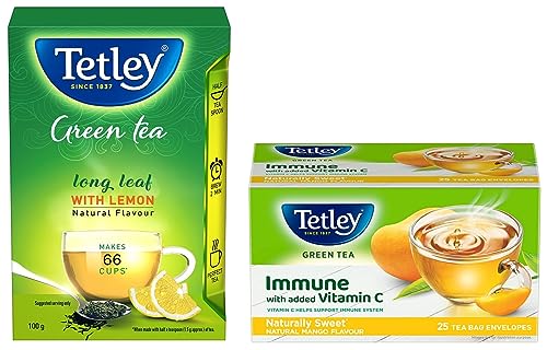Tetley Long Leaf | Natural Lemon Flavoured Green Tea with Anti-Oxidants | Green Tea | 100gStart afresh with Tetley! To stay refreshed all day sip the refreshing Tetley Long Leaf Lemon Green Tea. Being an excellent source of antioxidants Tetley Green Tea has various beneficial effects on health such as it helps you feel relaxed by hydrating your body and flushes out all the toxins from your body. The finest and long tea leaves are blended for a smooth and soft taste with an all-natural green tea flavor. You can now enjoy freshness whenever and wherever you want such as after breakfast before exercise or before bedtime. USAGE INSTRUCTIONS: Add just ½ tbsp. of Green Tea Leaves to boiling water. Brew the tea for 2 minutes. Add honey if desired & enjoy the perfect green tea!Tetley | Naturally Sweet Green Tea with Mango Flavour | Immune with Added Vitamin C | Green Tea | 25 Tea BagsTetley Green Tea is undoubtedly an excellent source of anti-oxidants. All the goodness now comes with immunity power of added Vitamin C with new Tetley Green Tea Immune Range. While anti-oxidants help cleanse your body from within Vitamin C helps support your bodyâs immune system. This green tea with no calories provides many more benefits like boosting fat metabolism helping to stay hydrated and helping to feel light and active. Driven by sustainability these green tea bags are 100% plastic-free and staple-free. The naturally sweet mango contain 100% natural flavors. # A cup of green tea contains as much as 5 times (5X) the anti-oxidants in an apple. (âUSDA Database for the Flavonoid Content of Selected Foodsâ Rel 3.3 March 2018)