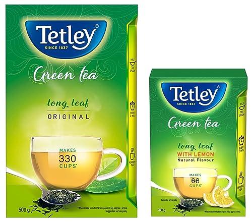 Tetley Long Leaf Original | All-natural Green Tea with Anti-Oxidants | Green Tea | 500gStart afresh with Tetley! To stay refreshed all day sip the refreshing Tetley Long Leaf Green Tea. Being an excellent source of antioxidants Tetley Green Tea has various beneficial effects on health such as it helps you feel relaxed by hydrating your body and flushes out all the toxins from your body. The finest and long tea leaves are blended for a smooth and soft taste with an all-natural green tea flavor. You can now enjoy freshness whenever and wherever you want such as after breakfast before exercise or before bedtime. USAGE INSTRUCTIONS: Add just ½ tbsp. of Green Tea Leaves to boiling water. Brew the tea for 2 minutes. Add honey if desired & enjoy the perfect green tea!Tetley Long Leaf | Natural Lemon Flavoured Green Tea with Anti-Oxidants | Green Tea | 100gStart afresh with Tetley! To stay refreshed all day sip the refreshing Tetley Long Leaf Lemon Green Tea. Being an excellent source of antioxidants Tetley Green Tea has various beneficial effects on health such as it helps you feel relaxed by hydrating your body and flushes out all the toxins from your body. The finest and long tea leaves are blended for a smooth and soft taste with an all-natural green tea flavor. You can now enjoy freshness whenever and wherever you want such as after breakfast before exercise or before bedtime. USAGE INSTRUCTIONS: Add just ½ tbsp. of Green Tea Leaves to boiling water. Brew the tea for 2 minutes. Add honey if desired & enjoy the perfect green tea!