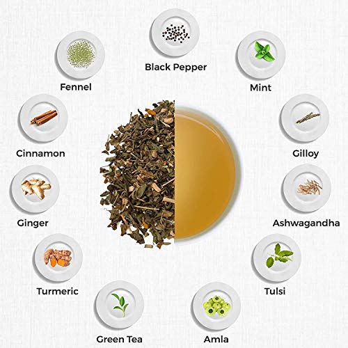 Immunity is the key to good health! Traditional ayurvedic medicinal herbs in this tea helps to strengthen the body's immunity and overall well-being. Amla or Indian Gooseberry is a rich source of Vitamin C that boosts immunity & metabolism. Ashwagandha the king of ayurvedic herbs is popularly consumed to reduce stress. Tulsi Ginger Turmeric and other ingredients rich in antioxidants collectively help to elevate the body's defense mechanism against diseases.