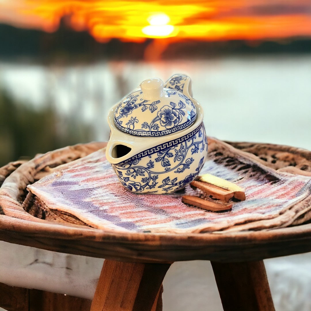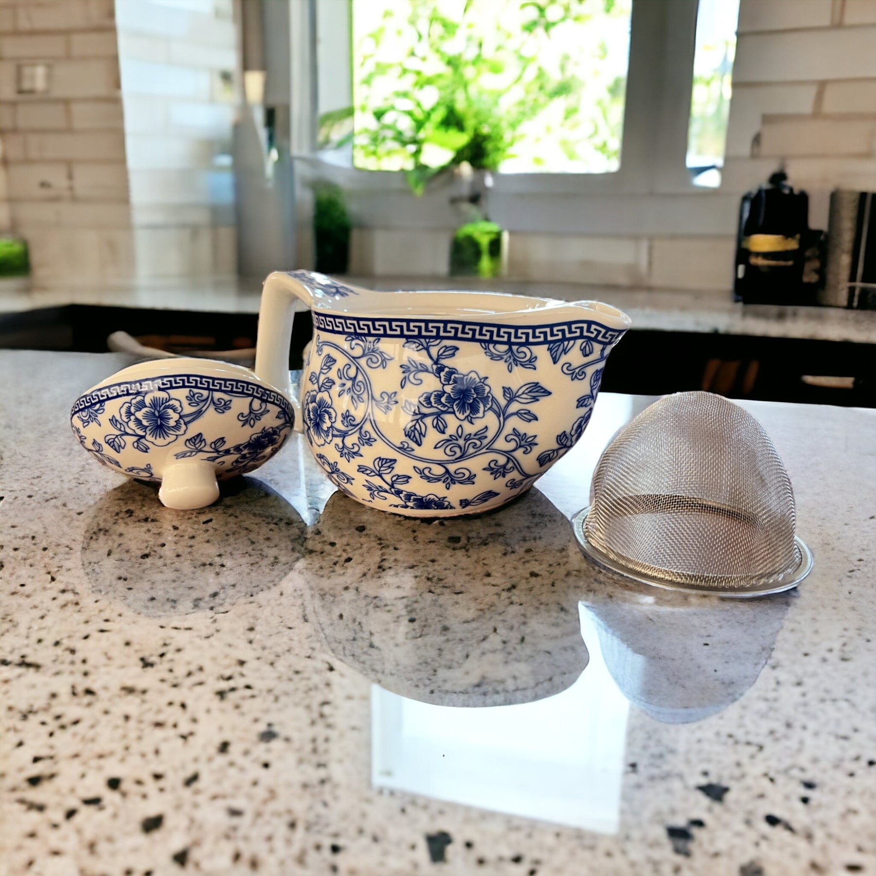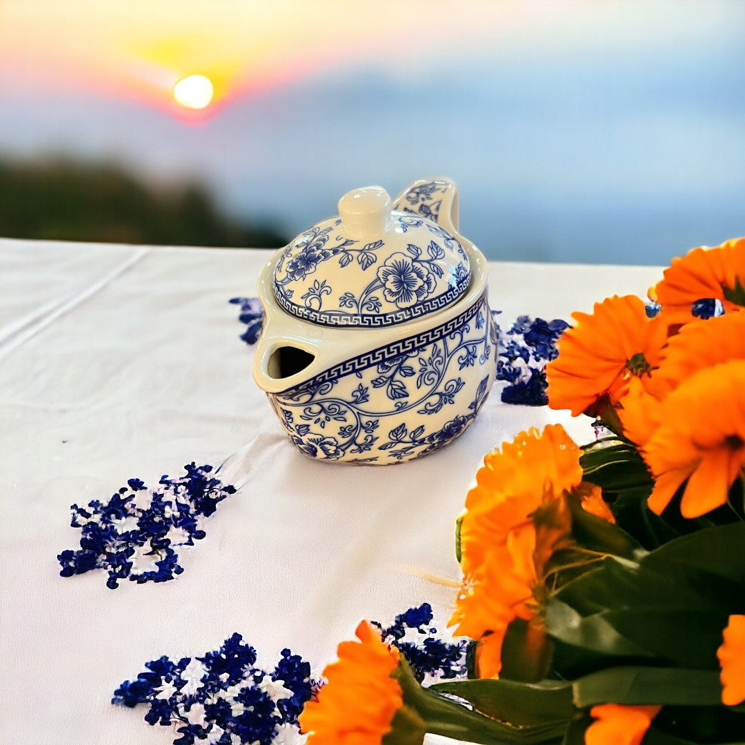 Beautiful porcelaine teapot with bright blue Peony blossoms painted on its mellow, glazed surface cheerfully greet you in the morning while you devour your favourite tea. Fine mesh of the stainless steel insert sieves out the tea leaves efficiently. Ideal for daily use, gatherings or any occasion for brewing upto 500ml of tea.  Teapot with strainer is uniquely shaped and designed to steep even fine loose-leaf teas. Brew up some delicate oolongs, white, green and your other favourite teas or handy bag teas and bring some innovative style to your home with this teapot.Net Quantity: 1 N