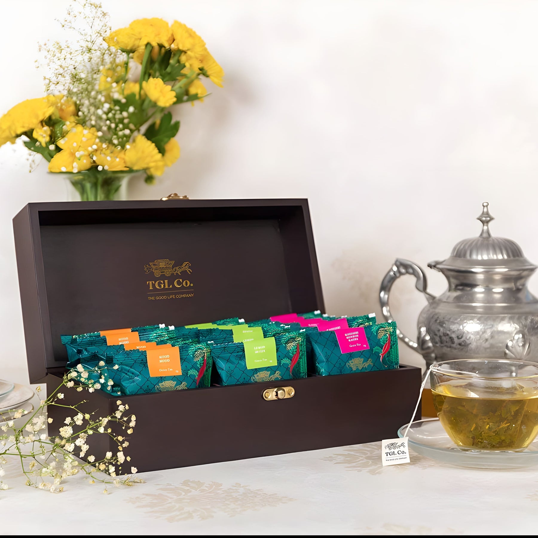 Crafted for convenience, here's an elegant wooden tea chest comprising of 30 teabags, ideal for gifting a tea aficionado or simply, to introduce someone to our mesmerizing world of specialty teas. The tea chest contains 10 biodegradable pyramid teabags of 3 different teas, packed individually in nitrogen flushed sachets. The box can be customized with a message or name of the recipient in gold.This gift box contains1 x Mogo Mogo Green Tea1 x Kashmiri Saffron Kahwa1 x Lemon Detox Green TeaNet weight (Gift box) - 950 gmBox Dimensions - 26.3cm x 14.1cm x 11cmNet weight (products) - 60 gm (10 sachets x 3) Total Tins in Gift Box - 30 sachets