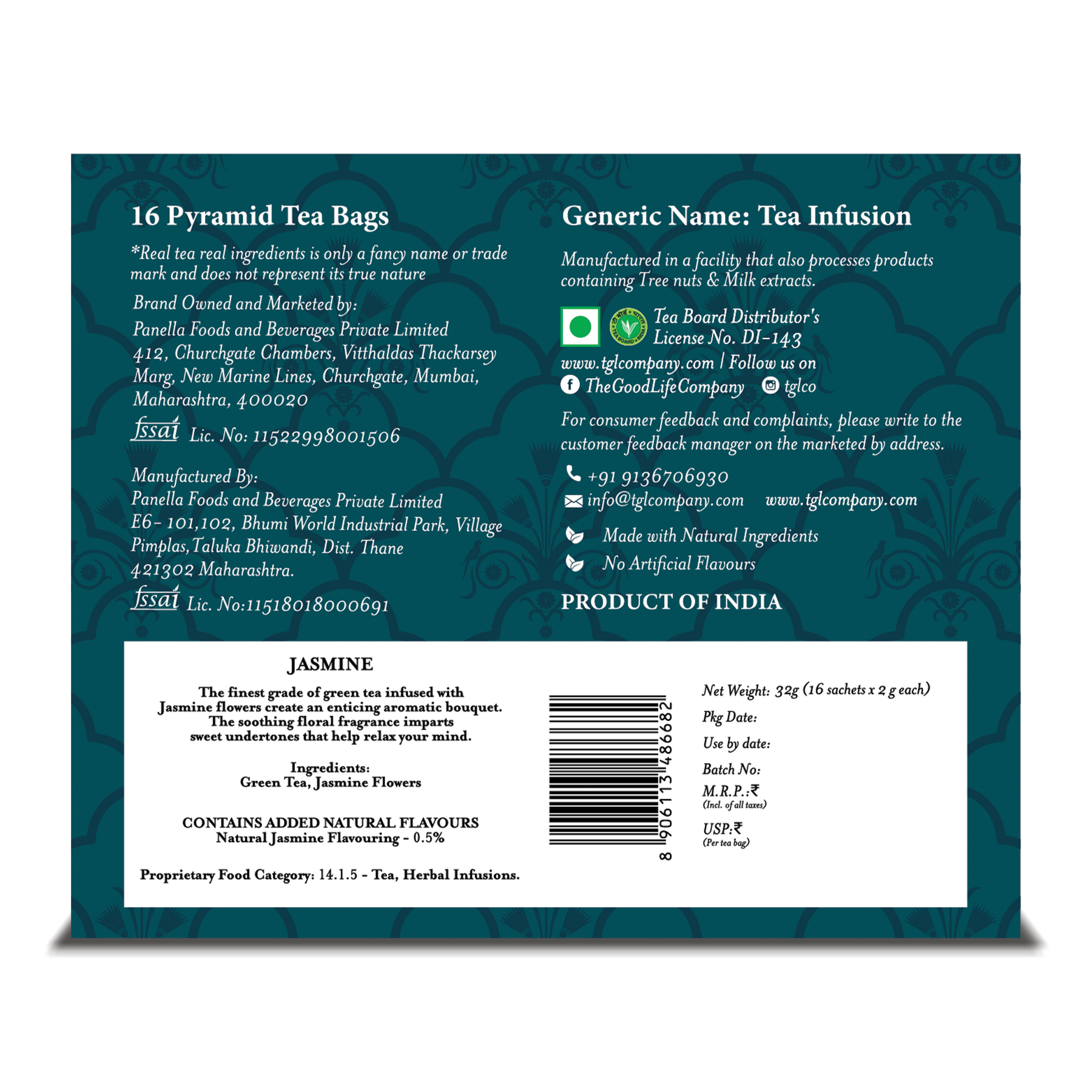 Aroma -Sweet mesmerizing floral aroma of jasmine and gentle notes of freshly hand-picked green tea leaves create an aromatic delight.Appearance -Pale Golden YellowTasting Notes - Sweet, Floral, Rich, Fresh, Delicate and Good aftertaste Caffeine - Medium Best Consumed - In afternoonComplementing Food - Sea Food and Asian CuisineTaste -Rich and delicate with a subtle sweetness. Green Tea adds depth and body to floral flavour. A TGL favourite!Shelf Life: 24 Months