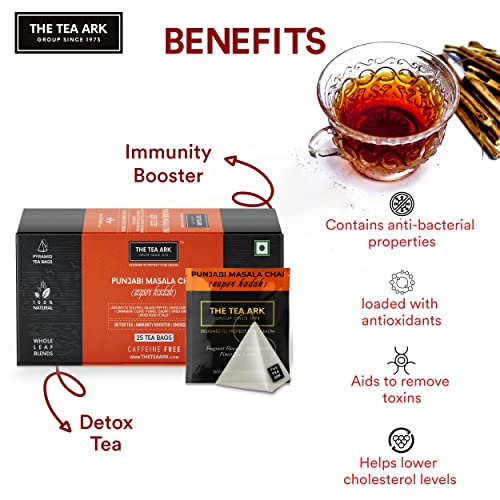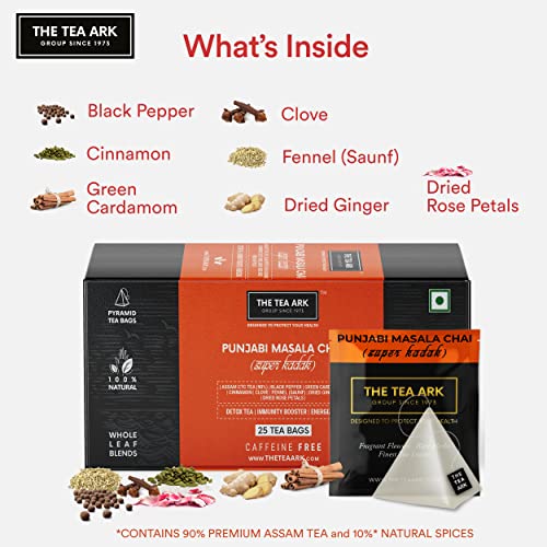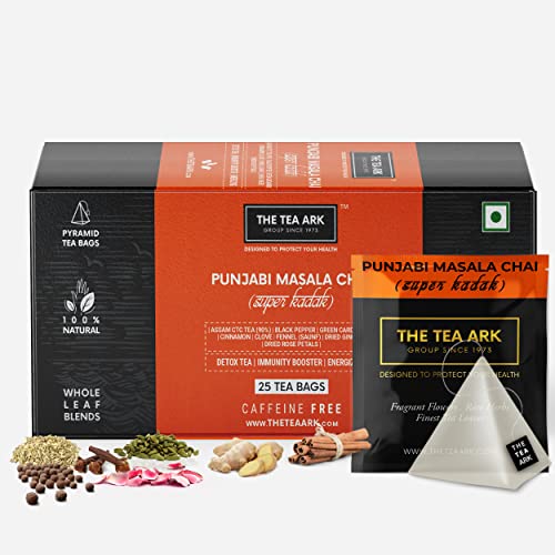 The Tea Ark Punjabi Masala Chai (25 Count) CTC Black Tea Blended with Black Pepper Cardamom Cinnamon Clove Fennel (Saunf) Dried Ginger Rose Petals - Pyramid Tea Bags (25 Tea Bags Punjabi Chai)