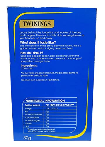 This Twinings of London pure camomile tea is naturally caffeine free and made using only 100% pure camomile blossoms. It is a light clean flavour with a soothing effect. Includes 20 individually sealed bags inside each box. Six boxes of this pure camomile tea come inside each case.