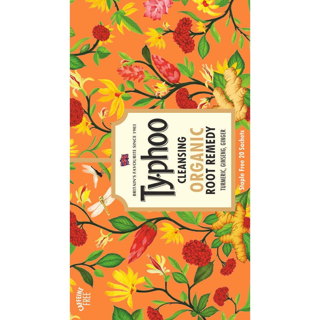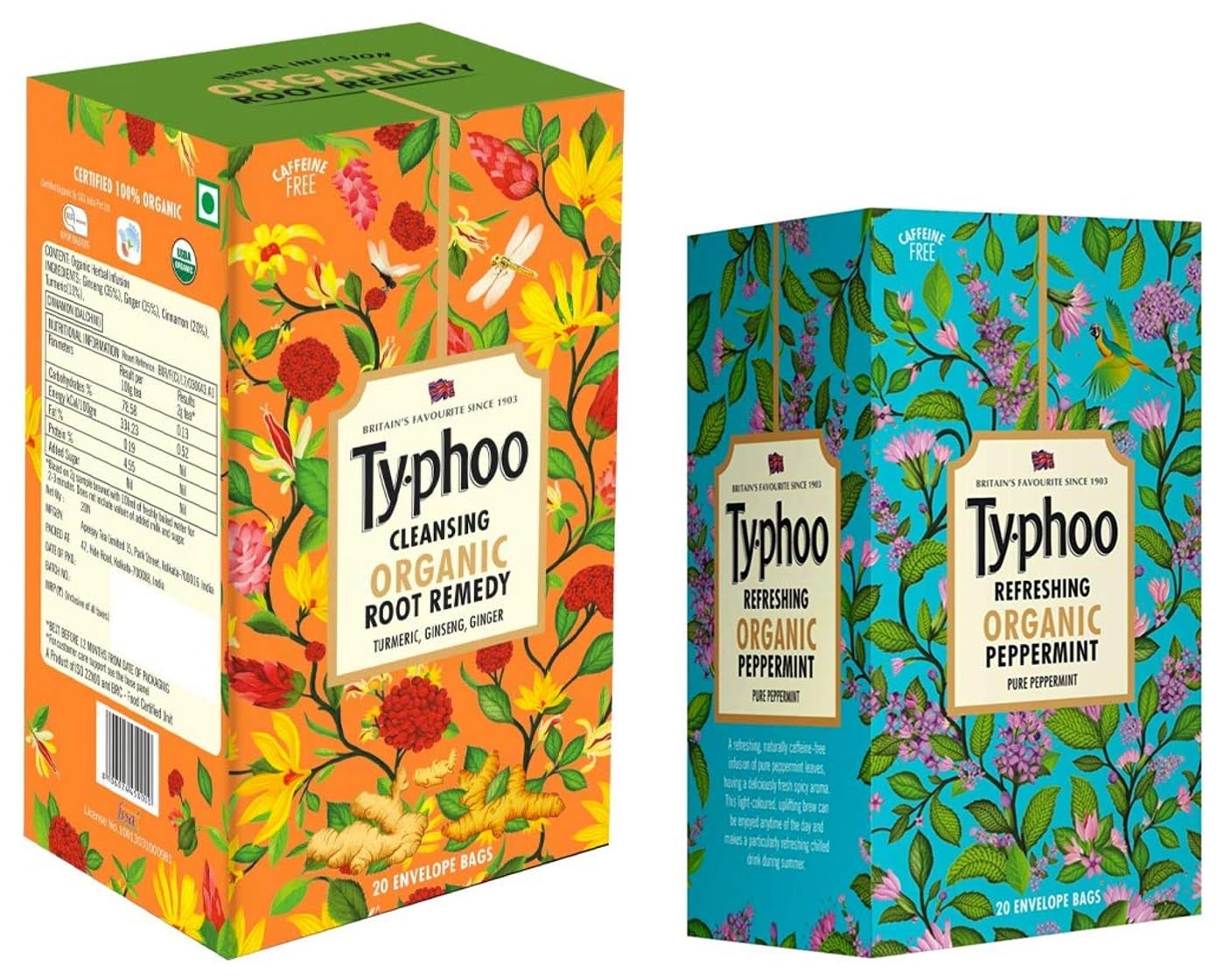 Typhoo Cleansing Organic Root Remedy Tea Bag (20 Tea Bags)A caffeine free turmeric infused blend with natural detoxifiers and immunity boosters. The aromatic and earthy notes of Indian ginseng root combined with flavourful cinnamon and ginger naturally support your wellbeing.Typhoo Refreshing Organic Peppermint Tea with Pure Peppermint Tea Bags 20N x 1.2g = 24gA refreshing naturally caffeine free infusion of pure peppermint leaves having a deliciously fresh spicy aroma. This light-coloured uplifting brew can be enjoyed anytime of the day and makes a particularly refreshing chilled drink during summer.