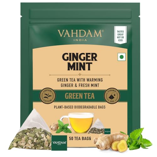 VAHDAM Ginger Mint Green Tea Bags (50 Count) Med Caffeine Non-GMO Gluten-Free Naturally High Grown Green Tea | Whole Loose Leaf Tea Bags | Resealable Ziplock Pouch