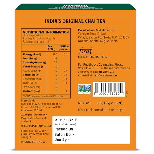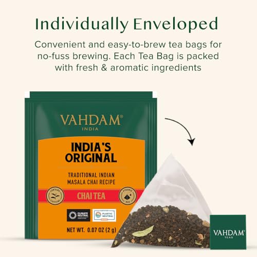 VAHDAM India's Original Masala Chai Tea Bags (15 Count) Non-GMO Gluten-Free No Added Flavoring | Blended w/Savory Exotic Spices | Individually Wrapped Pyramid Tea Bags | Direct from Source