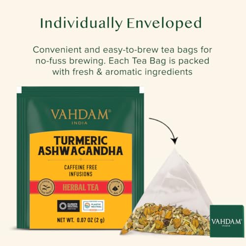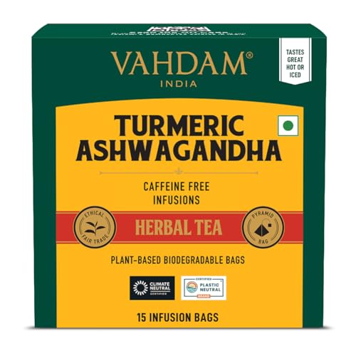 VAHDAM Turmeric Ashwagandha Herbal Tea Bags (15 Count) 100% Pure Herbal Blend - Turmeric Ashwagandha Lemongrass Black Pepper & Licorice | Brew It As Hot Or Iced Tea
