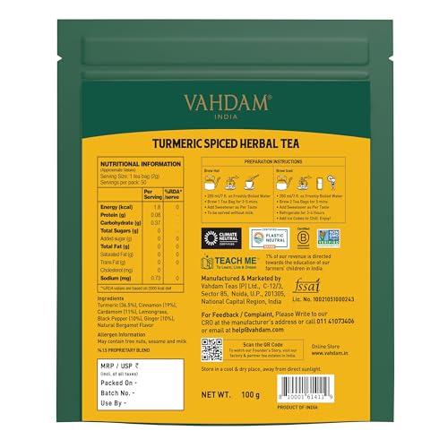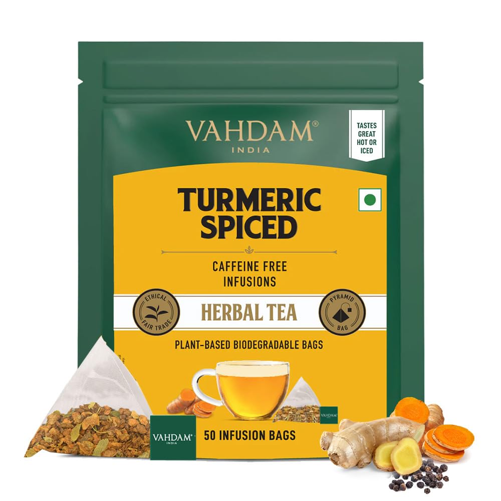 VAHDAM Turmeric Spice Herbal Tea Bags (50 Count) Caffeine Free Non-GMO Gluten-Free | 100% Pure Herbal Tisane - Savory & Spicy | Whole Loose Leaf Tea Bags | Resealable Ziplock Pouch