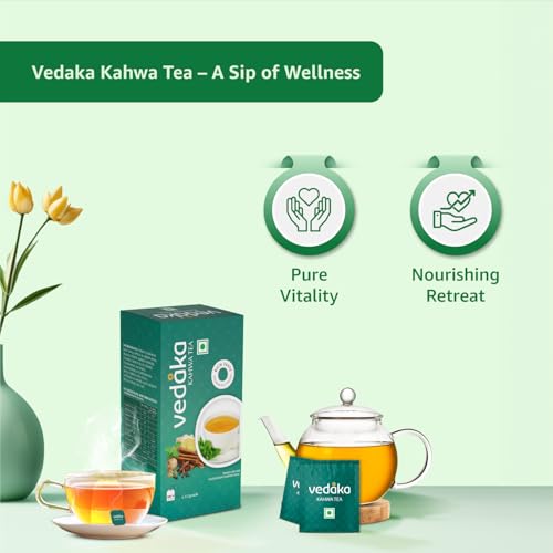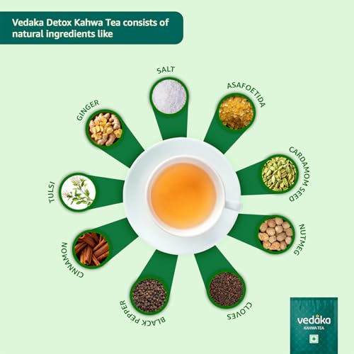 Introducing Vedaka Detoxifying Kahwa Tea. The tea is infused with a melodious blend of herbs and spices including salt ginger tulsi cinnamon black pepper cloves nutmeg asafoetida and cardamom seed. This carefully measured blend of ingredients provides a natural and effortless way to detoxify and cleanse your body. Each tea bag is also individually wrapped to ensure freshness in every cup that you brew. It is simple to make as well. Just pour 100-120ml of hot water into a cup with the tea bag and let rest for 2-3 minutes after which the warm water will be infused with the freshness of the Kahwa teabag. Store it in a cool and dry place.