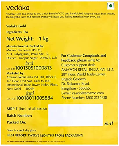 Vedaka Gold Tea 1 kgVedaka Gold is made from high quality leaves perfectly blended using state of the art technology to give you a rich and smooth taste to start your morning right. Enjoy the rich flavor of tea leaves coupled with rich aroma to elevate your daily tea- drinking experience. Available only on Amazon and Amazon Pantry.Vedaka Whole Cumin 500gAll vedaka spices are hygienically packed and undergo rigorous laboratory tests to meet stringent food safety norms.