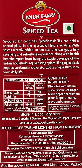Technical Details Weight 250 Grams Ingredient Type Vegetarian Brand Wagh Bakri Item Package Quantity 1 Form Loose Leaf Manufacturer Wagh Bakri