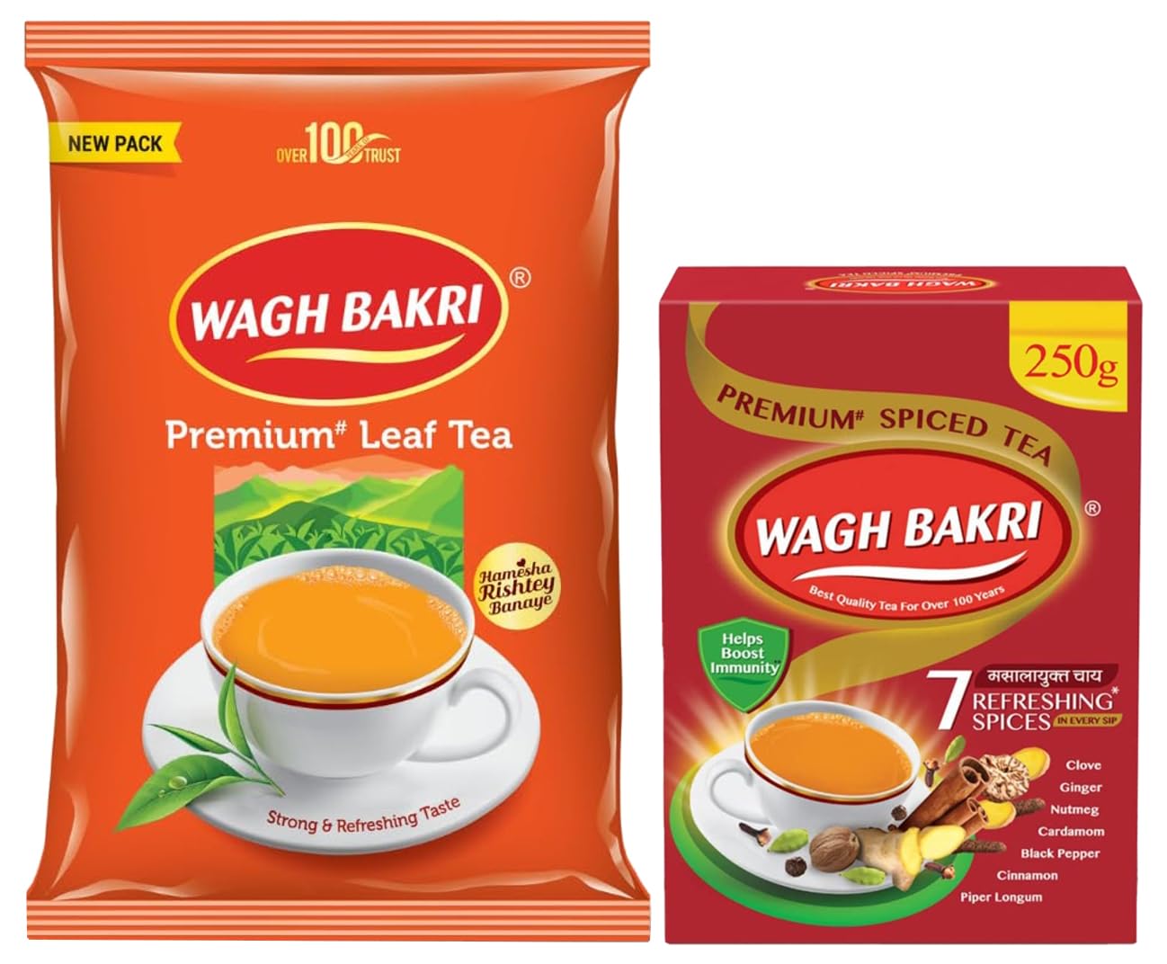 Wagh Bakri Premium Leaf Tea Poly Pack 500gWhy Wagh Bakri Premium Leaf Tea? At Wagh Bakri Tea Group we believe tea is a social catalyst that spreads peace and harmony bringing people together to build relationships. To make your tea moments more delightful and bonds stronger Wagh Bakri brings to you Premium Leaf Tea known for its premium quality for over 100 years. What makes it unique? Wagh Bakri Tea is renowned for its premium quality which promises strong taste stimulating aroma and rich colour. Handpicked from the best tea gardens in India and blended by tea experts this premium leaf tea ensures a delightful tea drinking experience. When to enjoy this tea? Enjoy a hot cup of premium goodness and rejuvenate your senses anytime. Storage: Store in a cool dry place.Wagh Bakri® Premium Spiced Tea | With 7 Refreshing Spices |250 gA refreshing blend for a refreshing mood. Looking for a tea that is more than just a tea? Look no further as Wagh Bakri brings you Premium Spiced Tea an invigorating blend of Wagh Bakri tea combined with the goodness of Indian spices. Wagh Bakri has been known for its best quality tea for over 100 years helping Indians brew moments of togetherness and stronger relationships. Enjoy the premium taste of our tea while taking care of yourself with a flavourful cup that weaves malty flavours of tea and exotic flavours of Indian spices like Cardamom Cinnamon Black Pepper Clove Ginger Piper Longum and Nutmeg. Make every moment exciting. Steep for four to six minutes depending on desired strength you require for that perfect cup and keep coming back to Wagh Bakri® Spiced Tea when exertion hits at times of illness or to turn your family time into happy times. *Based on the information given on spices board Govt. of India. The claims have been backed up by various independent studies. #This is only a brand name and does not represent its true nature.*Our Product is not intended to diagnose treat or prevent any disease or condition. The Claims are based on benefits concluded by Ayurvedic literature publicly available; neither intended to be medical advice nor an alternative to medical attention and the same is subject to consumption of healthy balanced diet.
