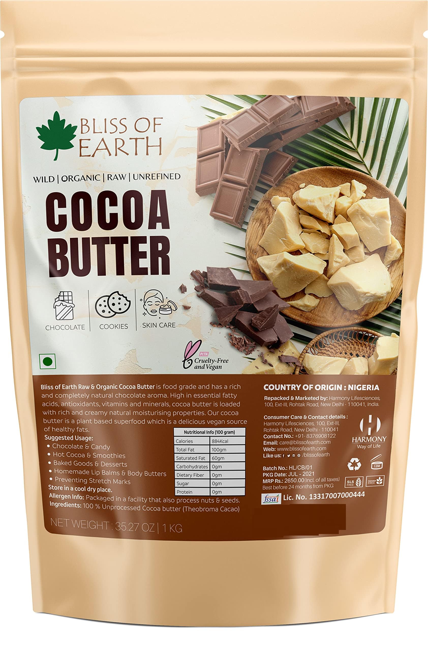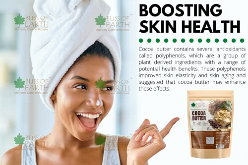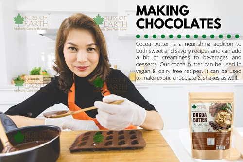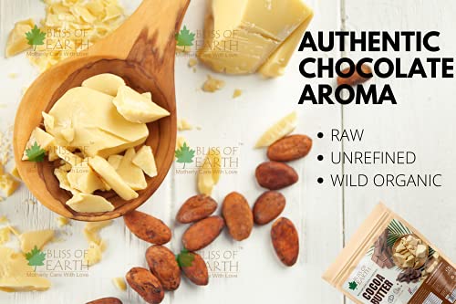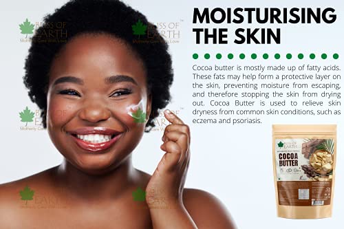 Bliss of Earth Raw & Organic cocoa butter is food grade and has a rich and completely natural choclate aroma. High in essential fatty acids antioxidants vitamins and minerals cocoa butter is loaded with rich and creamy natual moisturising properties. Our cocoa butter is a plant based superfood which is a delicious vegan source of healthy fats. Suggested Usage: * Chocolate & Candy * Hot Cocoa & Smoothies * Baked Goods & Desserts * Homemade Lip Balms & Body Butters * Preventing Stretch Marks