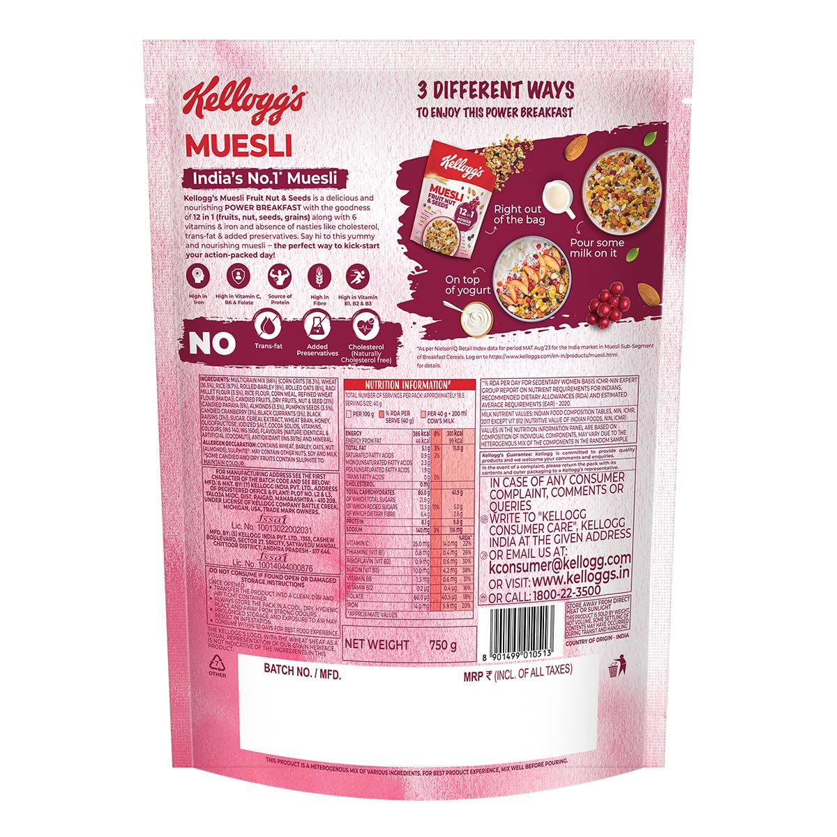 Kellogg's Muesli Fruit Nut & Seeds 750G | 12-In-1 Power Breakfast | India'S No. 1 Muesli | Multigrain Breakfast Cereal