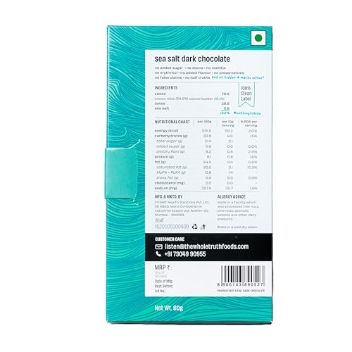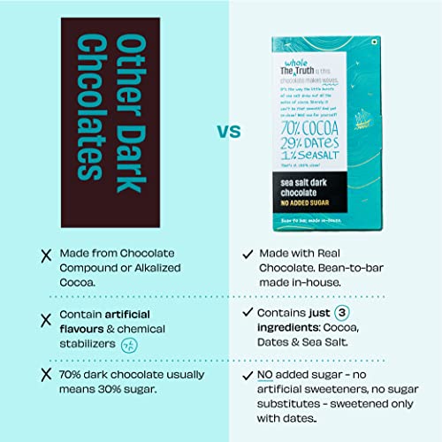 HomeGroceryCookingBaking SuppliesBaking Chocolates & CocoaThe Whole Truth Dark Chocolate - Sea Salt | Pack Of 3 X 80 Gram |Sweetened Only With Dates | 79% Cocoa 29% Dates 1% Sea Salt | No Artificial Flavours | Portion Controlled | 100% Vegetarian