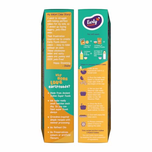 100% Clean Ingredients: This Katori Cake Mix is crafted using the finest quality ingredients like Millets Jaggery and a premium selection of dry fruits ensuring that your kids snack is pure and wholesome. Zero Refined Sugar: Sweetened naturally with dates powder & jaggery makes it a perfect go-to-snack for kids and a guilt free snack for everyone. Nutrient-Dense Dessert: This Ready-to-Bake Cake Mix is loaded with Almonds Cashew Sunflower Seeds and Dates both a delicious and nourishing treat for everyone. How to Make: No oven or Microwave oven needed. You just need an idli steamer. Prepare the batter by adding oil & milk. Pour into small Katoris and cups and just steam for 10 mins. Enjoy warm. Zero Junk Promise: Our Easy Cake Mix contains no refined sugar palm oil hydrogenated fats artificial flavors additives or colors. Promising you a junk free parenting!"