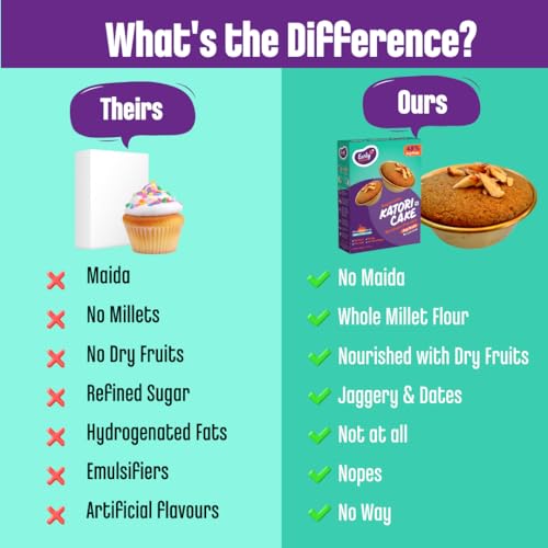 100% Clean Ingredients: This Katori Cake Mix is crafted using the finest quality ingredients like Millets Jaggery and a premium selection of dry fruits ensuring that your kids snack is pure and wholesome. Zero Refined Sugar: Sweetened naturally with dates powder & jaggery makes it a perfect go-to-snack for kids and a guilt free snack for everyone. Nutrient-Dense Dessert: This Ready-to-Bake Cake Mix is loaded with Almonds Cashew Sunflower Seeds and Dates both a delicious and nourishing treat for everyone. How to Make: No oven or Microwave oven needed. You just need an idli steamer. Prepare the batter by adding oil & milk. Pour into small Katoris and cups and just steam for 10 mins. Enjoy warm. Zero Junk Promise: Our Easy Cake Mix contains no refined sugar palm oil hydrogenated fats artificial flavors additives or colors. Promising you a junk free parenting!"