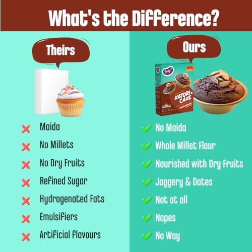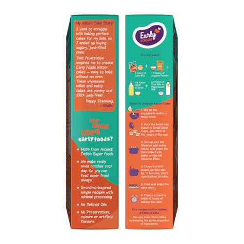 100% Clean Ingredients: This Katori Cake Mix is crafted using the finest quality ingredients like Millets Jaggery and a premium selection of dry fruits ensuring that your kids snack is pure and wholesome. Zero Refined Sugar: Sweetened naturally with dates powder & jaggery makes it a perfect go-to-snack for kids and a guilt free snack for everyone. Nutrient-Dense Dessert: This Ready-to-Bake Cake Mix is loaded with Almonds Cashew Sunflower Seeds and Dates both a delicious and nourishing treat for everyone. How to Make: No oven or Microwave oven needed. You just need an idli steamer. Prepare the batter by adding oil & milk. Pour into small Katoris and cups and just steam for 10 mins. Enjoy warm. Zero Junk Promise: Our Easy Cake Mix contains no refined sugar palm oil hydrogenated fats artificial flavors additives or colors. Promising you a junk free parenting!"