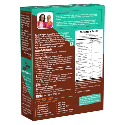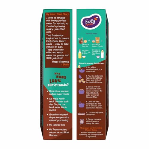 100% Clean Ingredients: This Katori Cake Mix is crafted using the finest quality ingredients like Millets Jaggery and a premium selection of dry fruits ensuring that your kids snack is pure and wholesome. Zero Refined Sugar: Sweetened naturally with dates powder & jaggery makes it a perfect go-to-snack for kids and a guilt free snack for everyone. Nutrient-Dense Dessert: This Ready-to-Bake Cake Mix is loaded with Almonds Cashew Sunflower Seeds and Dates both a delicious and nourishing treat for everyone. How to Make: No oven or Microwave oven needed. You just need an idli steamer. Prepare the batter by adding oil & milk. Pour into small Katoris and cups and just steam for 10 mins. Enjoy warm. Zero Junk Promise: Our Easy Cake Mix contains no refined sugar palm oil hydrogenated fats artificial flavors additives or colors. Promising you a junk free parenting!