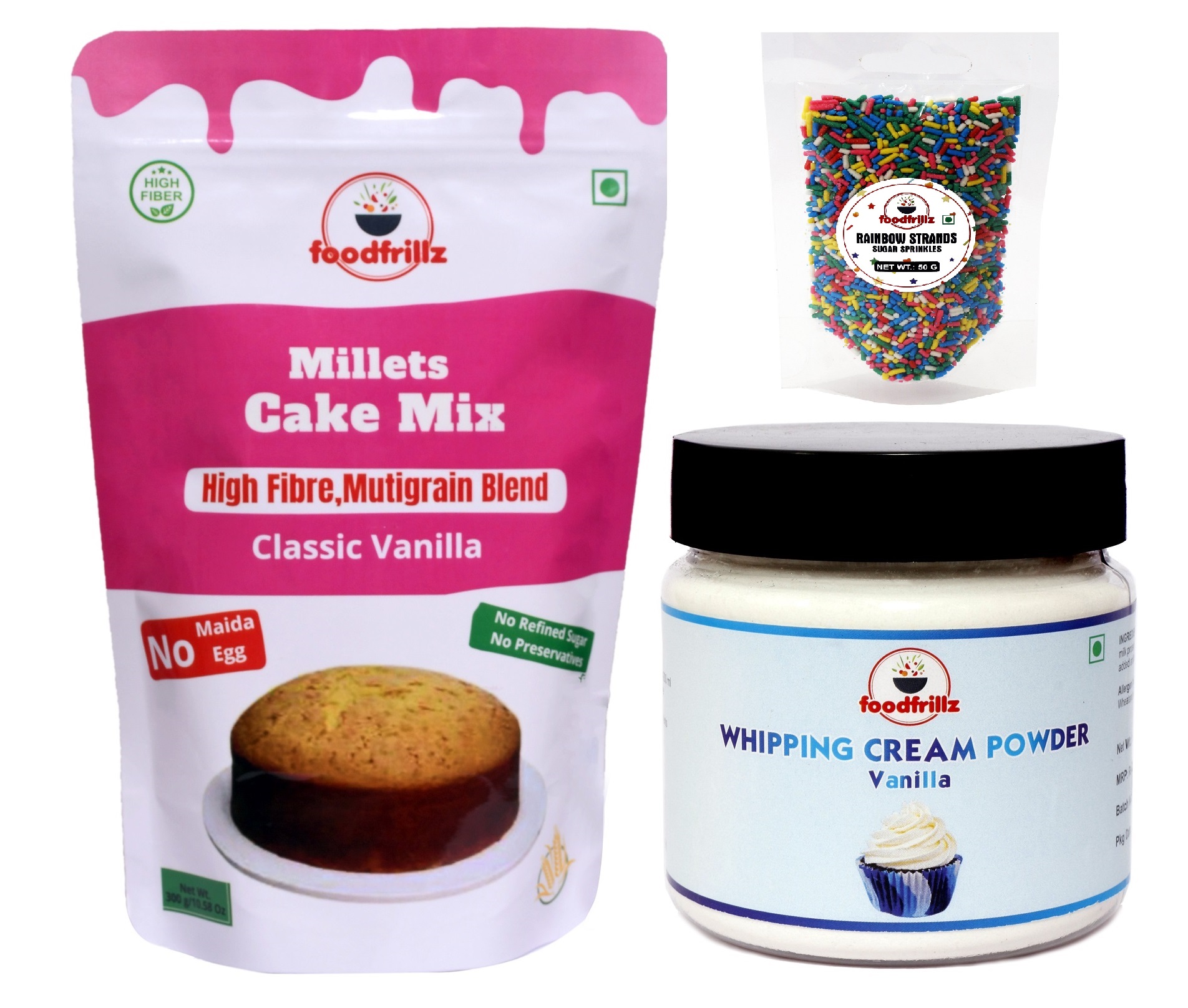 Foodfrillz Millet: Deliciously Healthy Cake Pre-Mix With Whipping Cream Powder(Vanilla) Rainbow Sprinkles (Strands) Combo of 3 (Classic Vanilla Flavor)