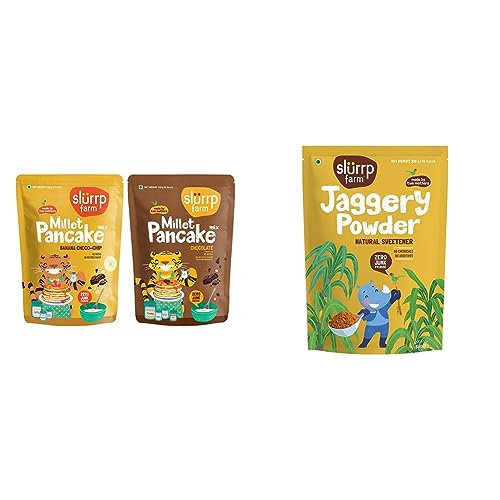 Slurrp Farm Instant Breakfast Millet Pancake Mix Banana Choco-Chip Supergrains And Chocolate Natural And Healthy Food 100% Vegetarian Eggless Healthy Breakfast for Kids & Adults150g (Pack Of 2)At slurp farm we make honest and healthy food just like you would at home. So this pancake mix has no preservatives artificial flavours and no colours. It is filled with the goodness of ragi foxtail millet and cocoa. Based on traditional pancake recipes from our family kitchen! Made by two mothers for you and your children.Slurrp Farm Natural Jaggery Powder 300 GSlurrp Farm is founded by two mothers for their children and yours. Our mission is to provide tasty and all natural alternatives to the junk food that surrounds us today. This means no preservatives no artificial flavours and no artificial colours. We are passionate about raising awareness of healthy eating for children by giving parents convenient food options which are as good as what we would make at home.