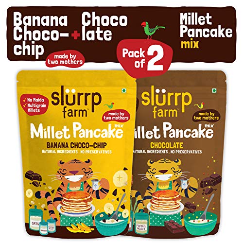 Slurrp Farm No Maida Macaroni Pasta | Gluten Free & Multigrain | Healthy Pasta made with Brown Rice and Corn | 400gContains No Maida/Wheat No Transfats No Preservatives and No Artificial Flavours. Made with Brown Rice and Corn which are a great source of dietary fibre B-vitamins and essential fatty acids. 100% vegan and gluten free. Low fat with less than 2g per 100g of servings. Just boil for 7-8 minutes toss in a pan with your choice of sauce and your favourite veggies. Made by two mothers for everyone in the family.Slurrp Farm Instant Breakfast Millet Pancake Mix Banana Choco-Chip Supergrains And Chocolate Natural And Healthy Food 100% Vegetarian Eggless Healthy Breakfast for Kids & Adults150g (Pack Of 2)At slurp farm we make honest and healthy food just like you would at home. So this pancake mix has no preservatives artificial flavours and no colours. It is filled with the goodness of ragi foxtail millet and cocoa. Based on traditional pancake recipes from our family kitchen! Made by two mothers for you and your children.