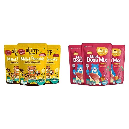 Slurrp Farm No Maida Pancake Mix | Instant Breakfast Mix Made with Oats and Jowar | 100% Vegetarian Eggless Healthy Breakfast for Kids & Adults | Banana Chocochip- Pack of 3 X 150gSlurrp Farms Millet Pancake Mix is a convenient and easy to make pancake mix. It is filled with the goodness of Supergrains and some yummy banana and Choco-chips to bring out the best flavour in our pancakes. Consisting of a lot of nutrients and no harmful ingredients it is a great option to have anytime for you and for your fussy little ones as well. About the Brand : At Slurrp Farm we are passionate about raising awareness of healthy eating for children and giving busy parents like us the convenience needed in terms of being able to find food options which are as good as what we would make at home. Our recipes always start at home from amongst our friends and families. After many home trials we perfect them in consultation with nutritionists and pediatricians.Slurrp Farm Millet Dosa Instant Mix | Supergrains And Beetroot | Natural And Healthy Food 150g (Pack Of 3)At slurp farm we make honest and healthy food just like you would at home. So this dosa mix has no preservatives no artificial flavours and no colours. It is filled with the goodness of five super grains (ragi red rice oat urad dal suji) beetroot and mild spices. Based on traditional dosa recipes from our family kitchen! Made by two mothers for you and your children.