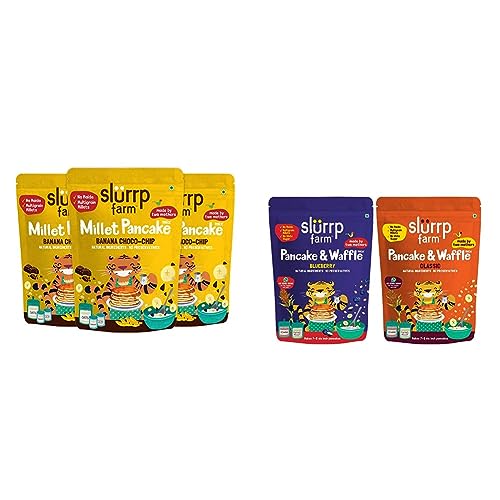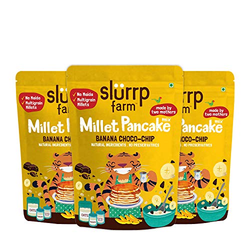 Slurrp Farm No Maida Pancake Mix | Instant Breakfast Mix Made with Oats and Jowar | 100% Vegetarian Eggless Healthy Breakfast for Kids & Adults | Banana Chocochip- Pack of 3 X 150gSlurrp Farms Millet Pancake Mix is a convenient and easy to make pancake mix. It is filled with the goodness of Supergrains and some yummy banana and Choco-chips to bring out the best flavour in our pancakes. Consisting of a lot of nutrients and no harmful ingredients it is a great option to have anytime for you and for your fussy little ones as well. About the Brand : At Slurrp Farm we are passionate about raising awareness of healthy eating for children and giving busy parents like us the convenience needed in terms of being able to find food options which are as good as what we would make at home. Our recipes always start at home from amongst our friends and families. After many home trials we perfect them in consultation with nutritionists and pediatricians.Slurrp Farm No Maida Pancake Mix | Instant Breakfast Mix made with Oats and Jowar | 100% Vegetarian Eggless Healthy Breakfast for Kids & Adults | Blueberry and Classic Combo- 150g X 2Filled with the goodness of Supergrains - Jowar Foxtail Millet and Oats. Made with No Maida No Preservatives No Artificial Flavours and No Artificial Colours.