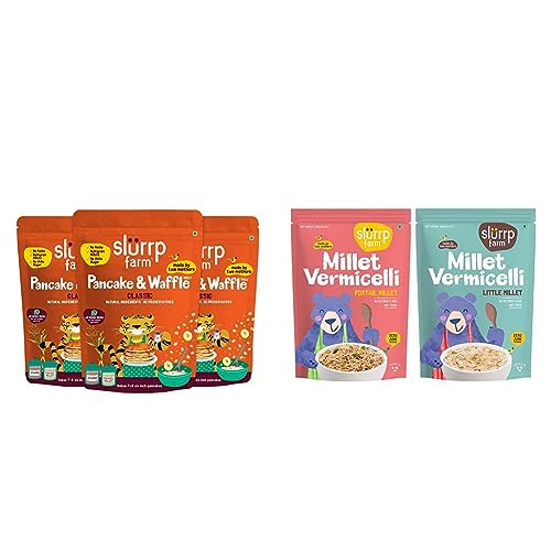 Slurrp Farm No Maida Pancake Mix | Instant Breakfast Mix made with Oats and Jowar | 100% Vegetarian Eggless Healthy Breakfast for Kids & Adults | Classic- Pack of 3 X 150gShelf Life: 365 Days; Ingredient Type: Vegetarian; Total Weight: 450gm; Classic Millet Pancake Mix (150 gm) x 3Slurrp Farm Millet Vermicelli Semiya – No Maida No White Rice Foxtail Millet and Little Millet Vermicelli 180 g each (Pack of 2)No maida no white rice. Zero trans fat saturated fat and cholesterol