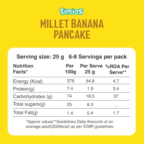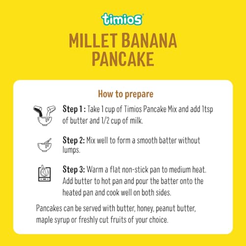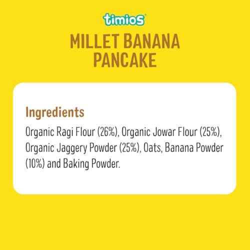 Timios Banana Pancake Mix makes flavourful fluffy and filling pancakes that satisfy the nutritional needs of every member of the family. It is packed with fiber-rich oats and millets sweetened with natural iron rich organic jaggery. In addition it has plenty of protein and other micronutrients essential for healthy growth. Just mix it with milk and delicious pancakes are ready in a Jiffy!