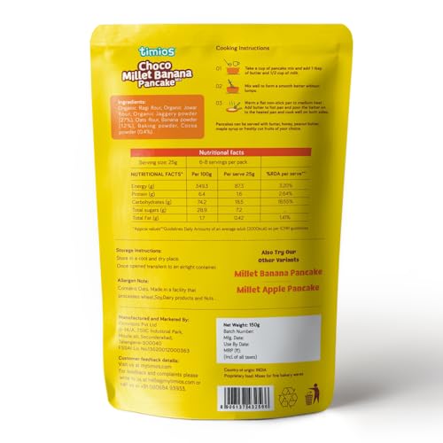 timios Banana Pancake Mix makes flavourful fluffy and filling pancakes that satisfy the nutritional needs of every member of the family. It is packed with fiber-rich oats and millets sweetened with natural iron rich organic jaggery. In addition it has plenty of protein and other micronutrients essential for healthy growth. Just mix it with milk and delicious pancakes are ready in a Jiffy!
