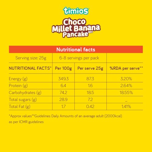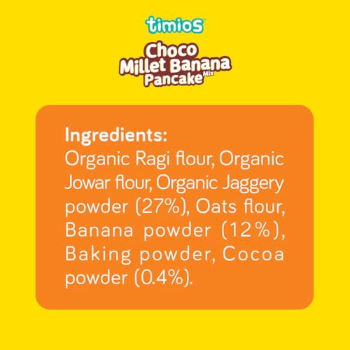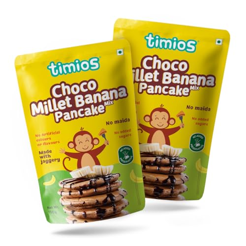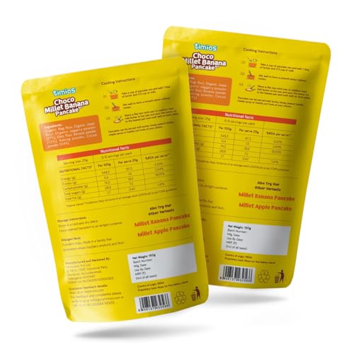 Timios Banana Pancake Mix makes flavourful fluffy and filling pancakes that satisfy the nutritional needs of every member of the family. It is packed with fiber-rich oats and millets sweetened with natural iron rich organic jaggery. In addition it has plenty of protein and other micronutrients essential for healthy growth. Just mix it with milk and delicious pancakes are ready in a Jiffy!