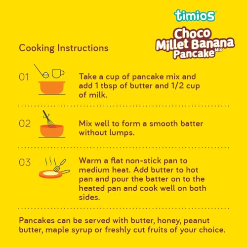 Timios instant pancake mix makes flavourful fluffy and filling pancakes that satisfy the nutritional needs of every member of the family. It is packed with fiber-rich oats and millets sweetened with natural iron rich organic jaggery. In addition it has plenty of protein and other micronutrients essential for healthy growth. Just mix it with milk and delicious pancakes are ready in a Jiffy!