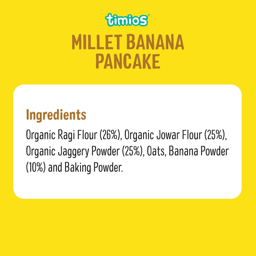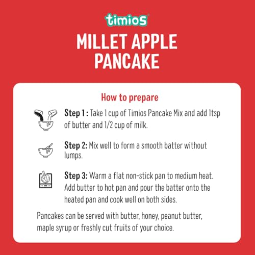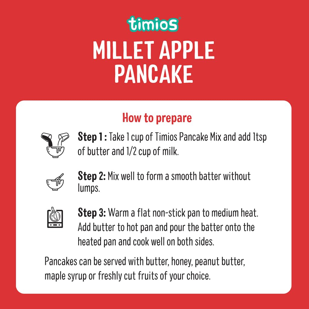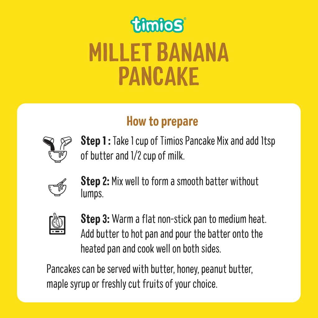 Timios Millet Pancake Mix makes flavourful fluffy and filling pancakes that satisfies the nutritional needs for every member of the family. It is packed with fiber-rich oats and millets sweetened with natural iron rich organic jaggery. In addition it has plenty of protein and other micronutrients essential for a healthy growth. Just mix it with milk and delicious pancakes are ready in a Jiffy!